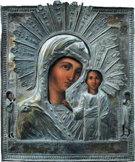КАЗАНСКАЯ ИКОНА БОЖИЕЙ МАТЕРИ, СО СВЯТЫМИ НА ПОЛЯХ Икона в окладе